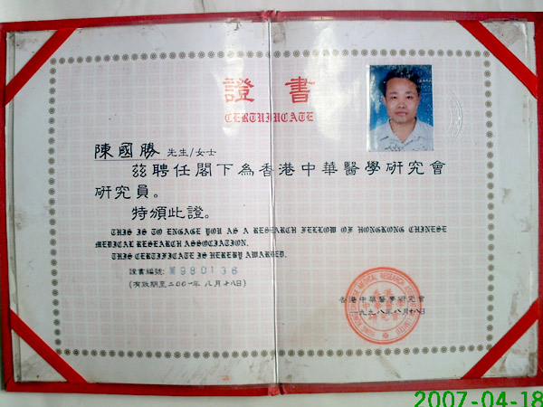 这是香港中华医学研究会聘任陈主任为香港中华医学研究会研究员证书。