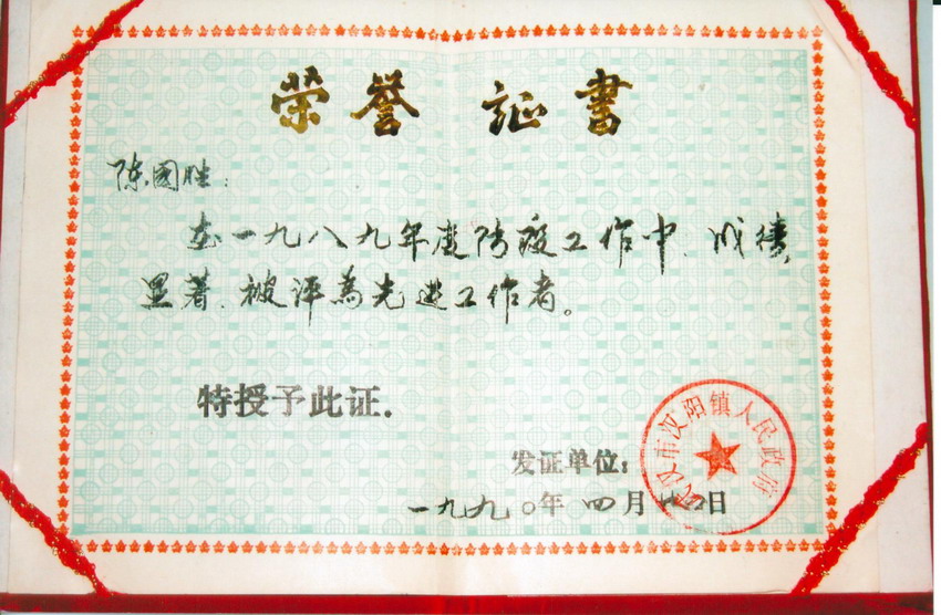 1989年陈主任荣获政府荣誉证书