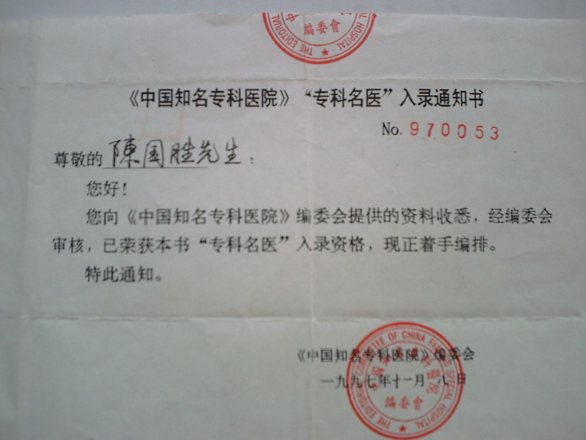 中国知名专科医院发给陈主任的“专科名医”入录通知书